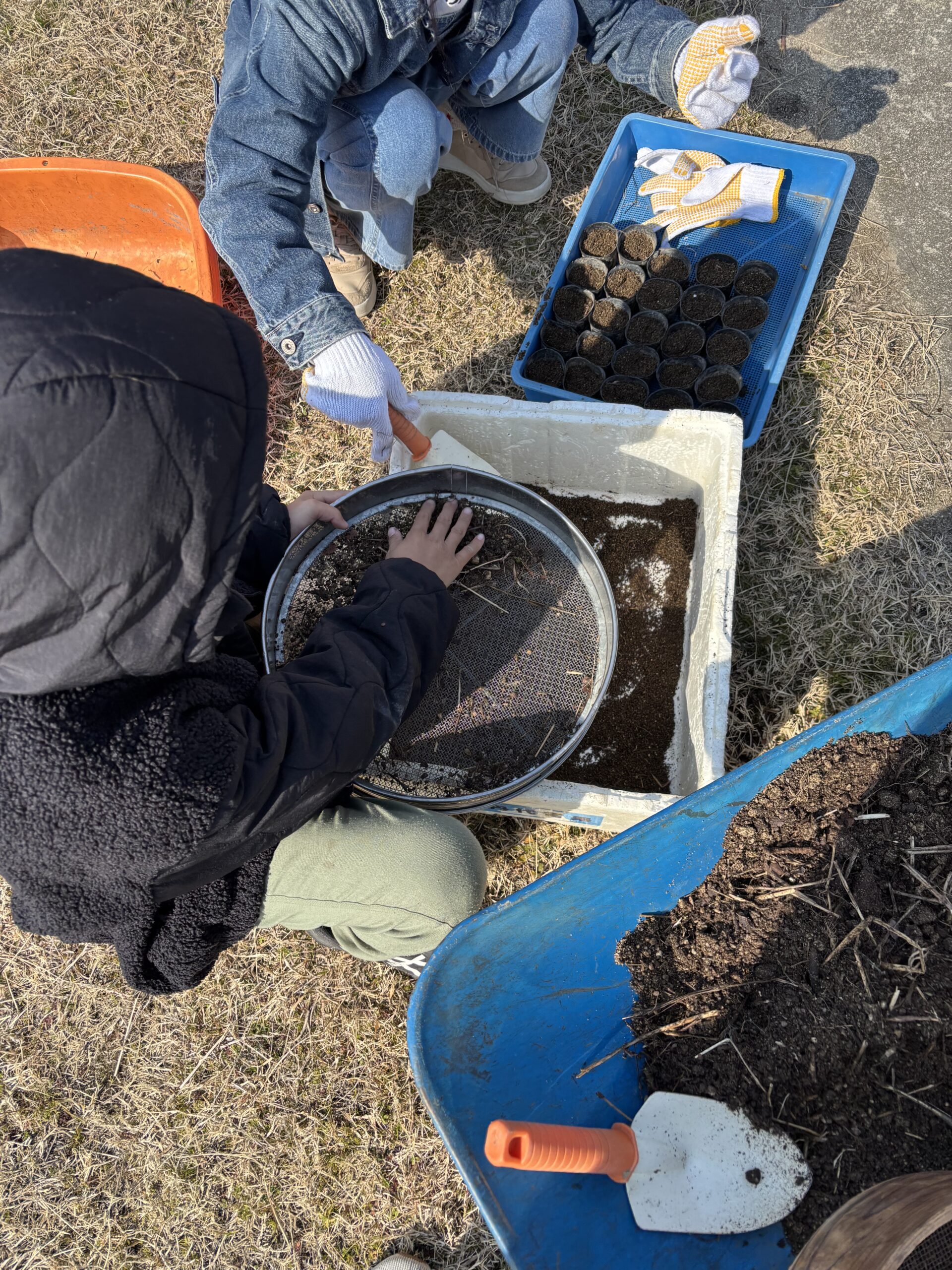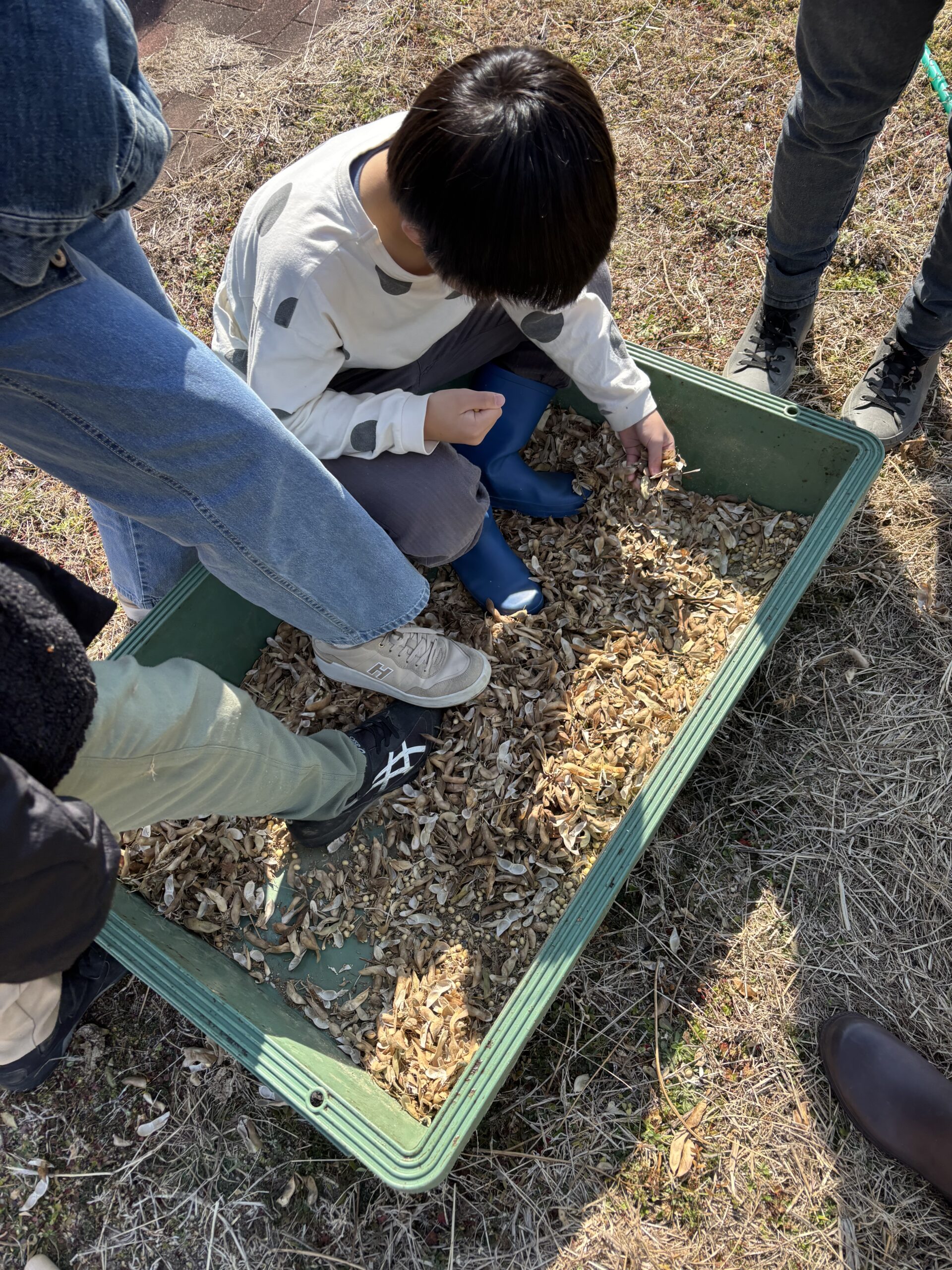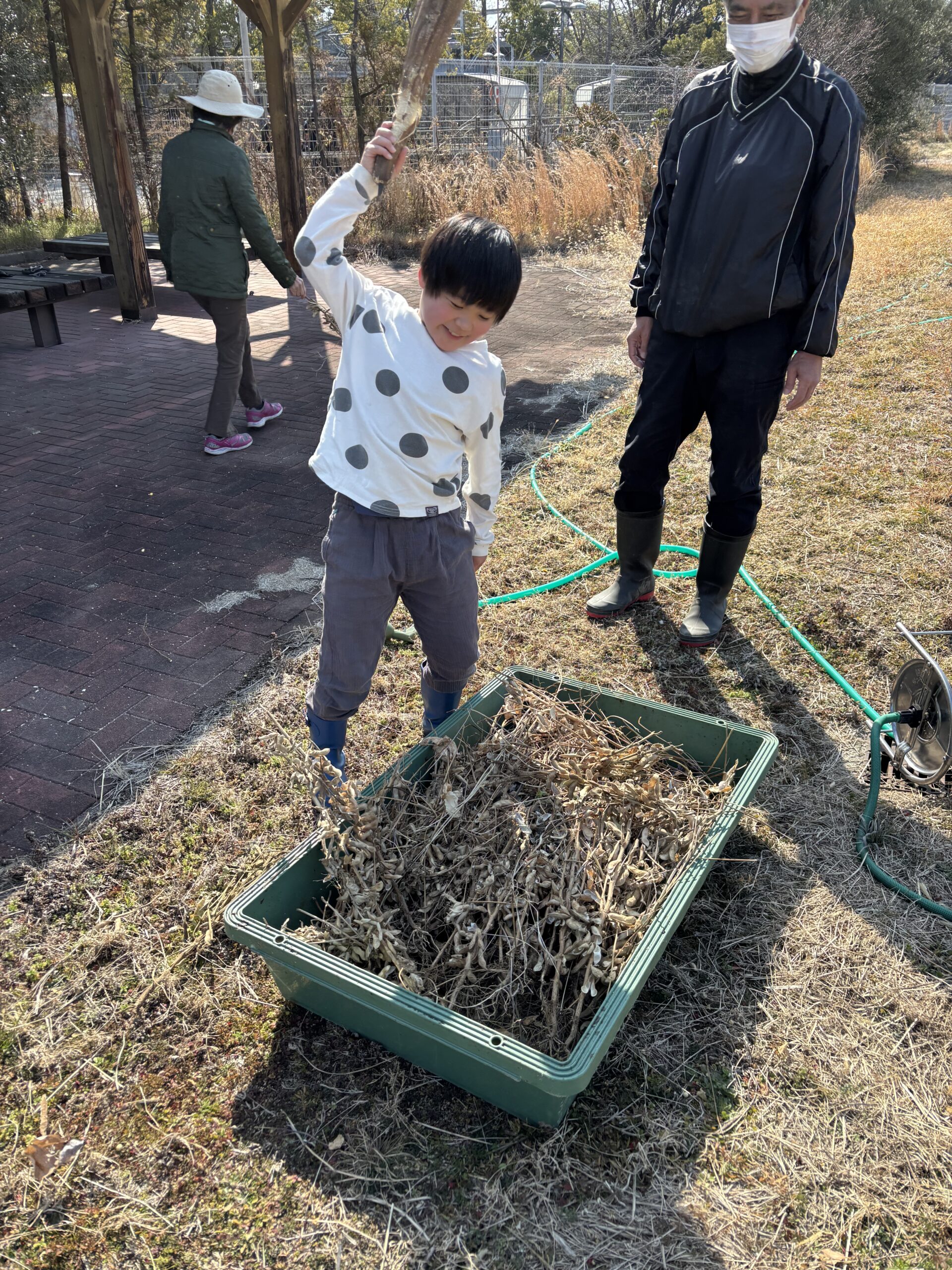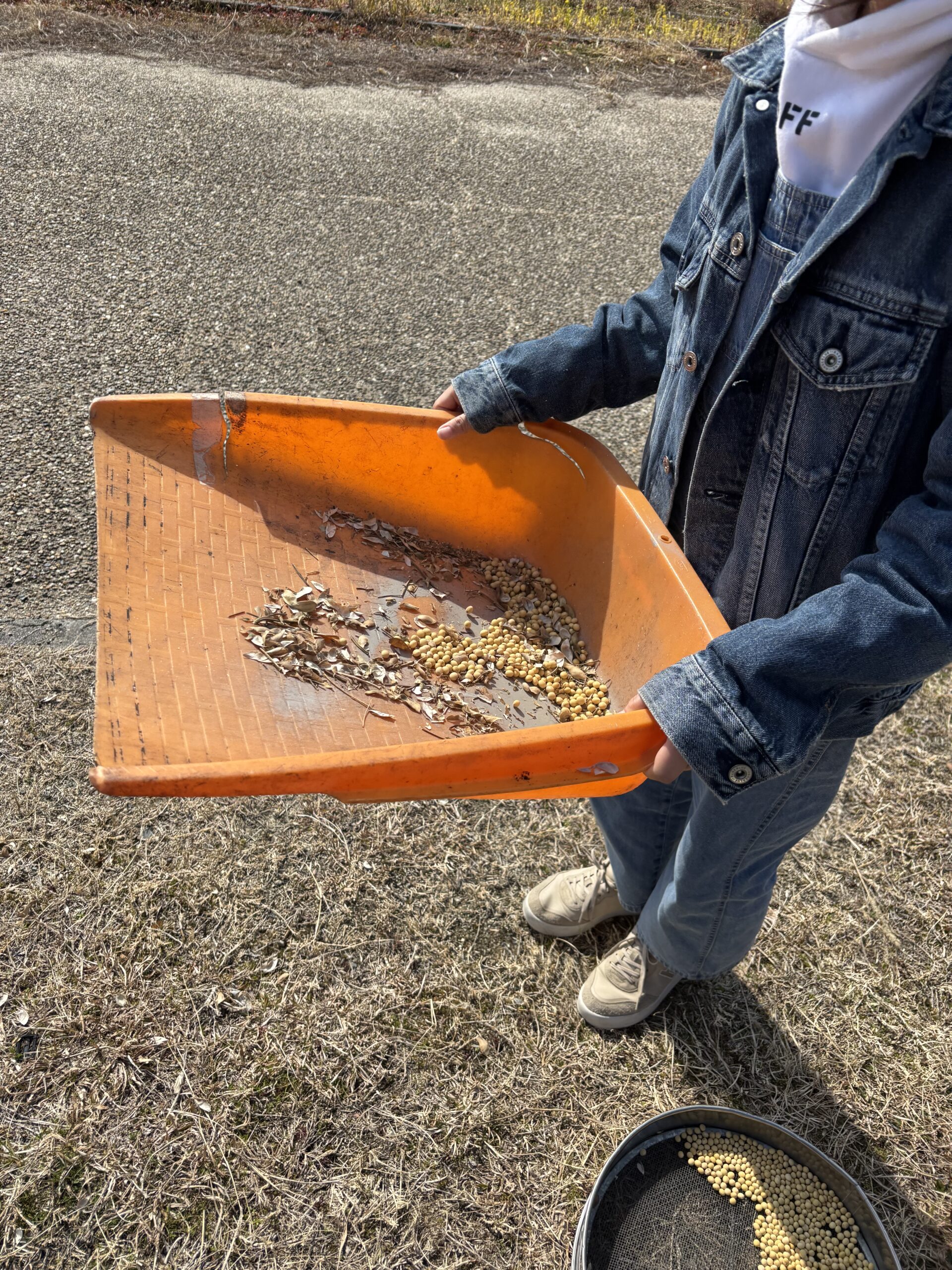 鞘から豆が出たら、みのに入れ、振ってごみを飛ばして
