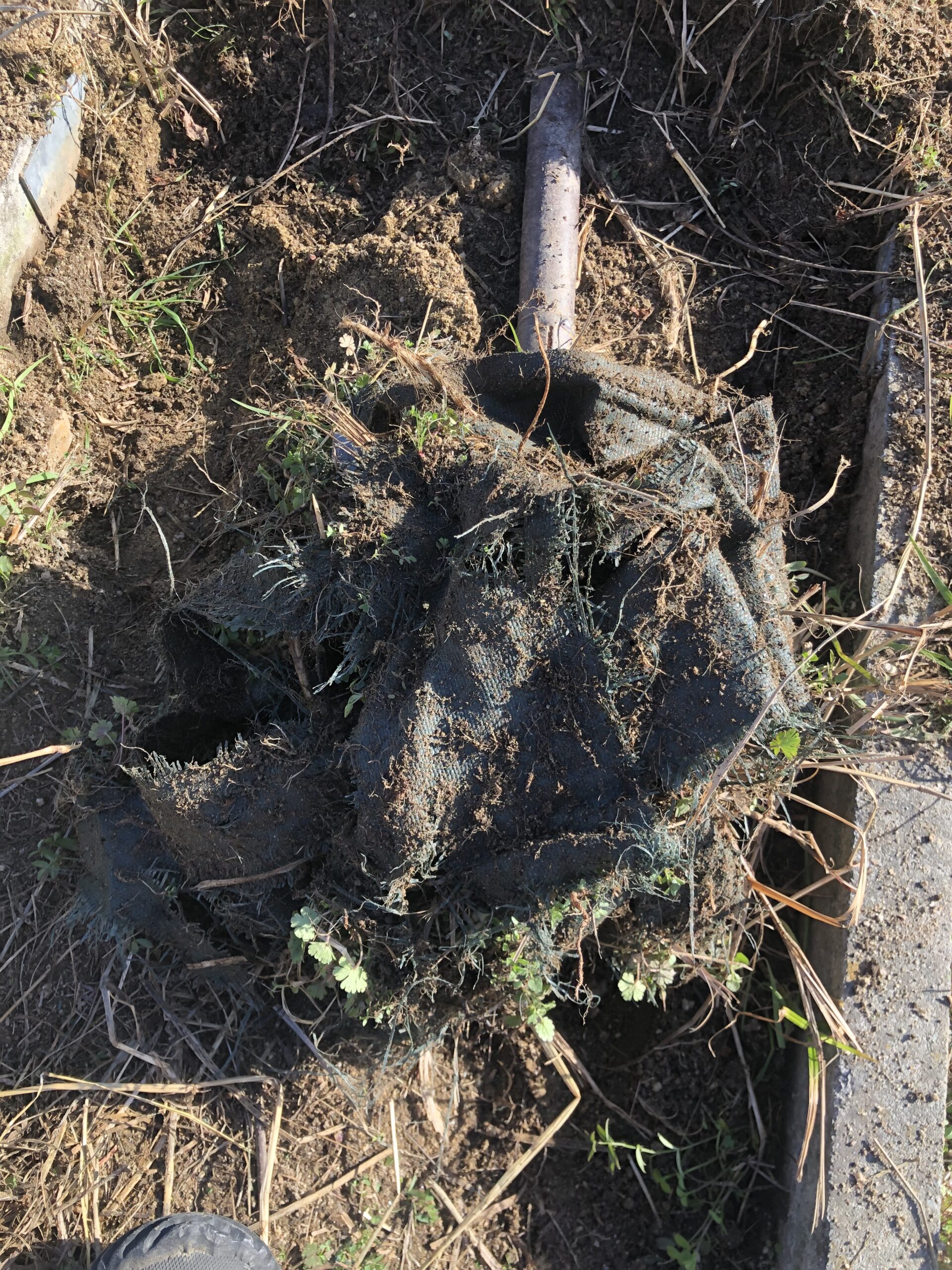 プラスチック製防草シートをはがし、