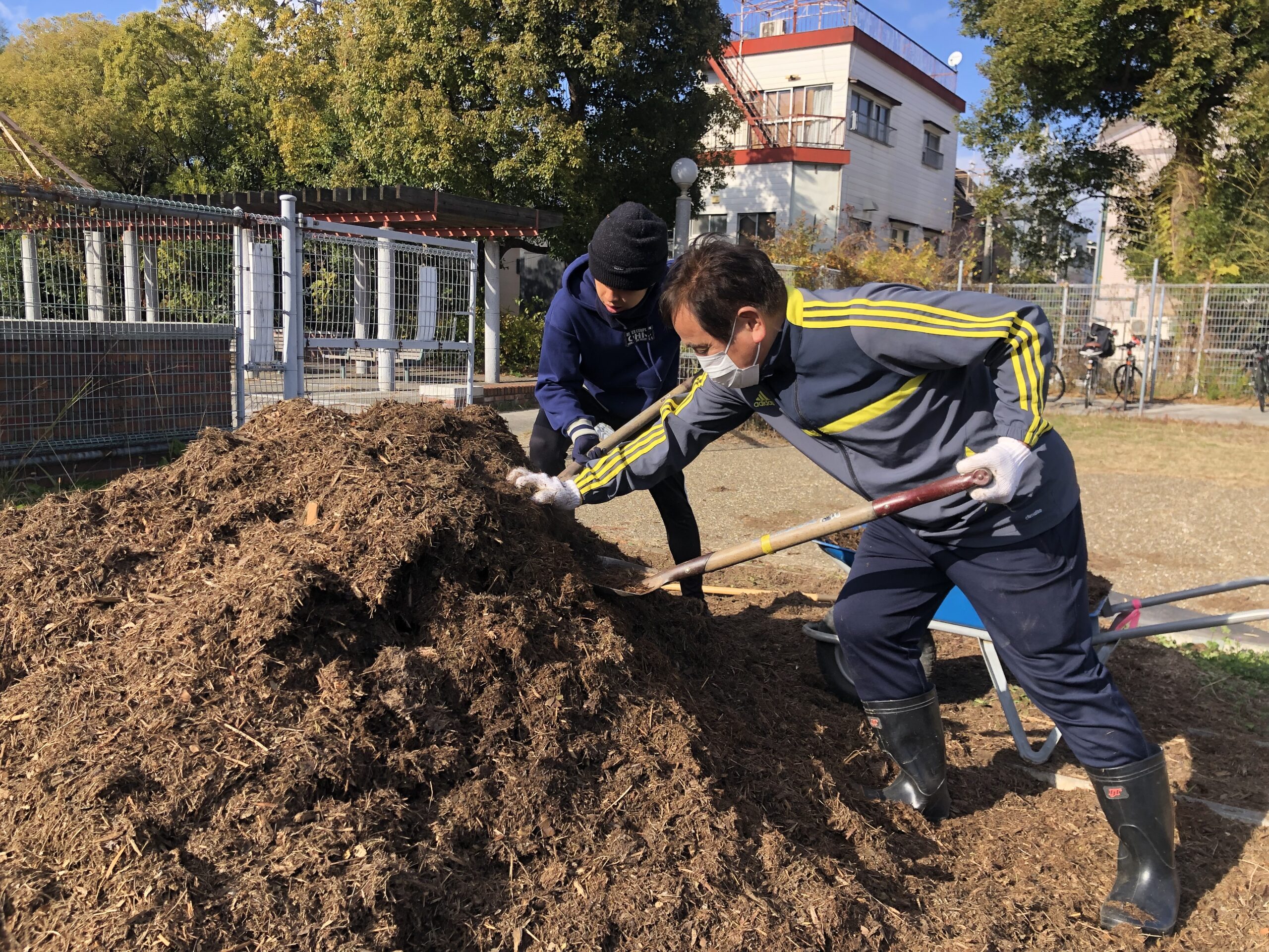 深く掘った上に木質チップを敷き詰める作業。