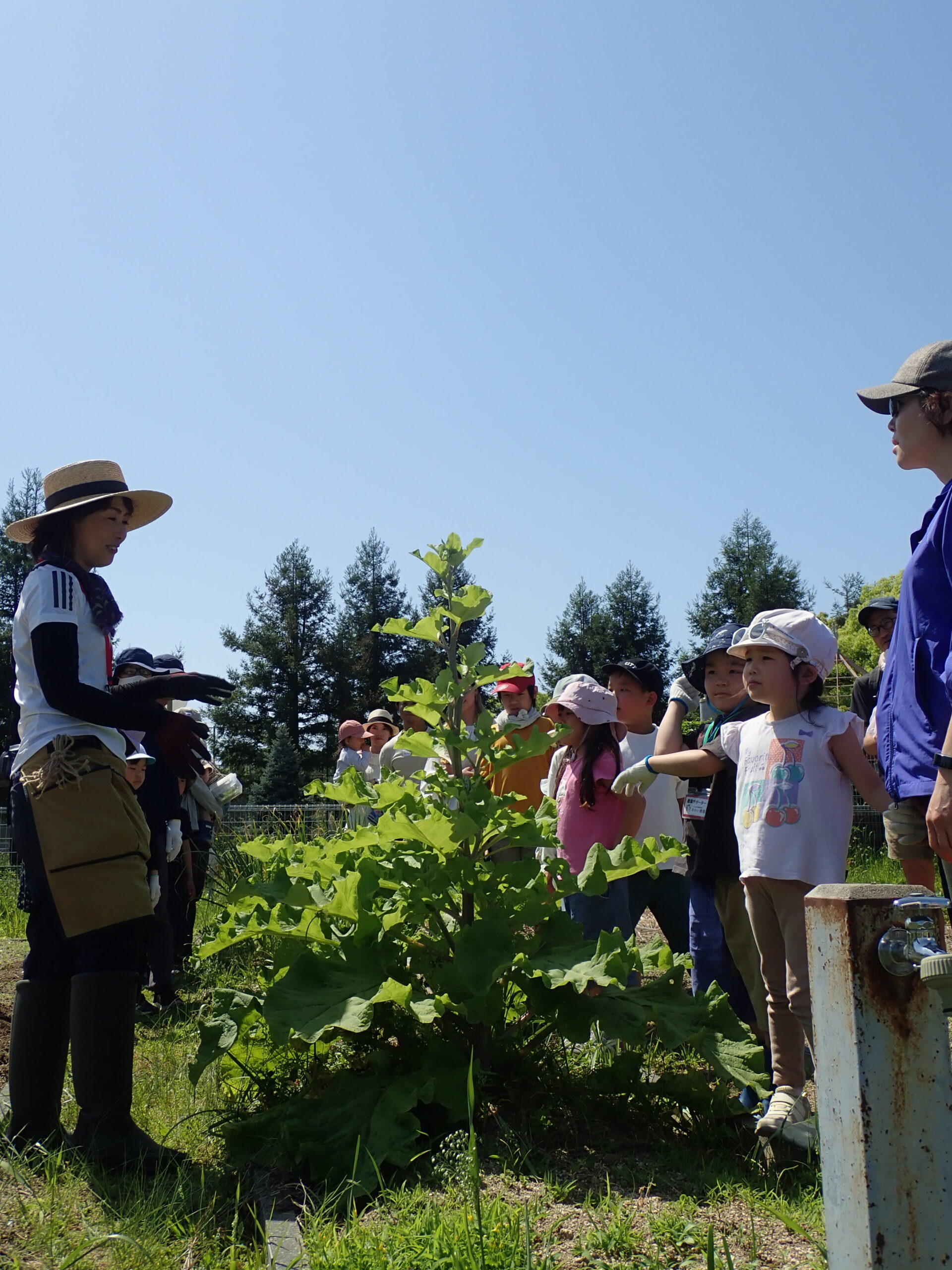 カレーゾーン、巨大なぞの葉っぱ、など、農園を散策して、夏野菜の植付をしました。