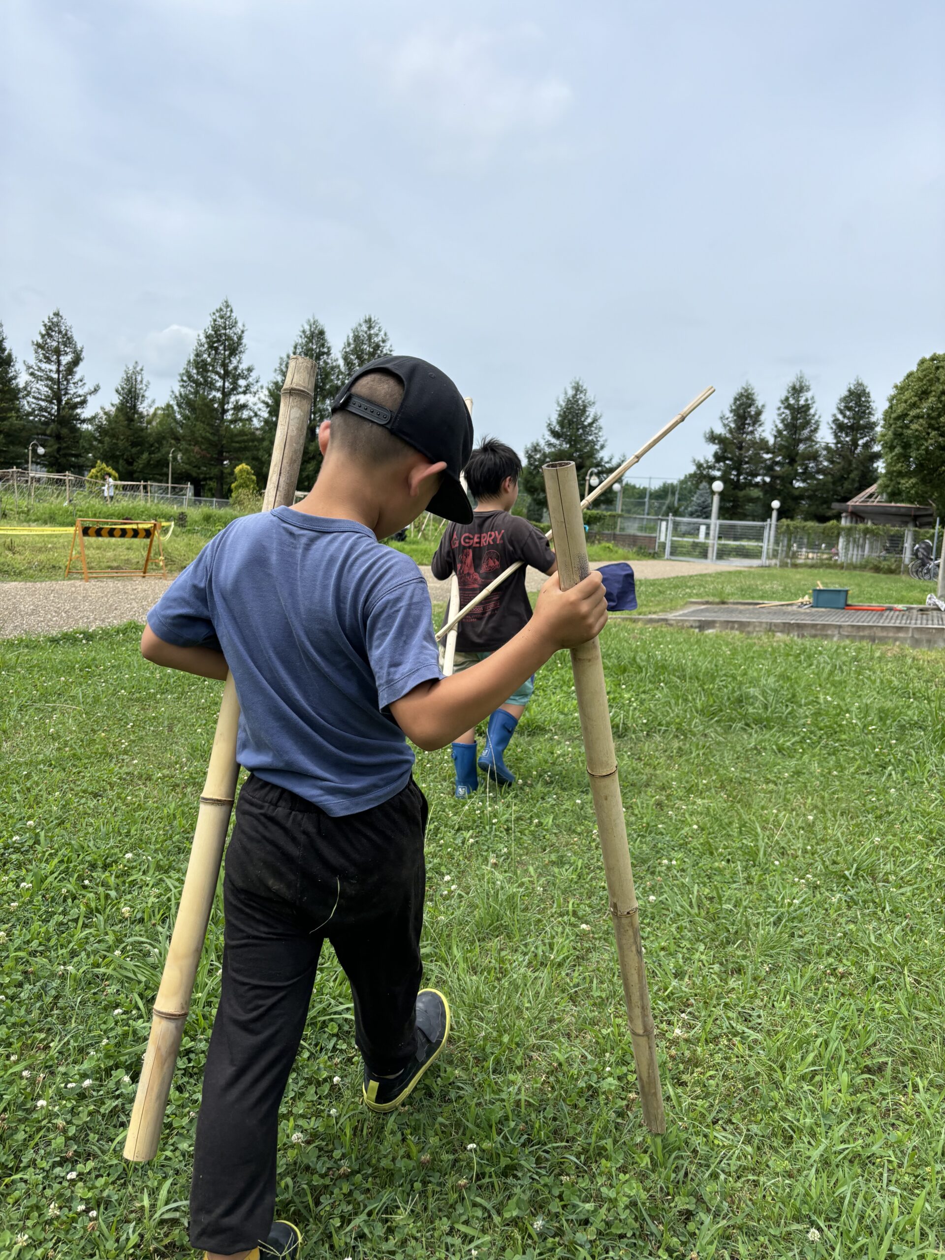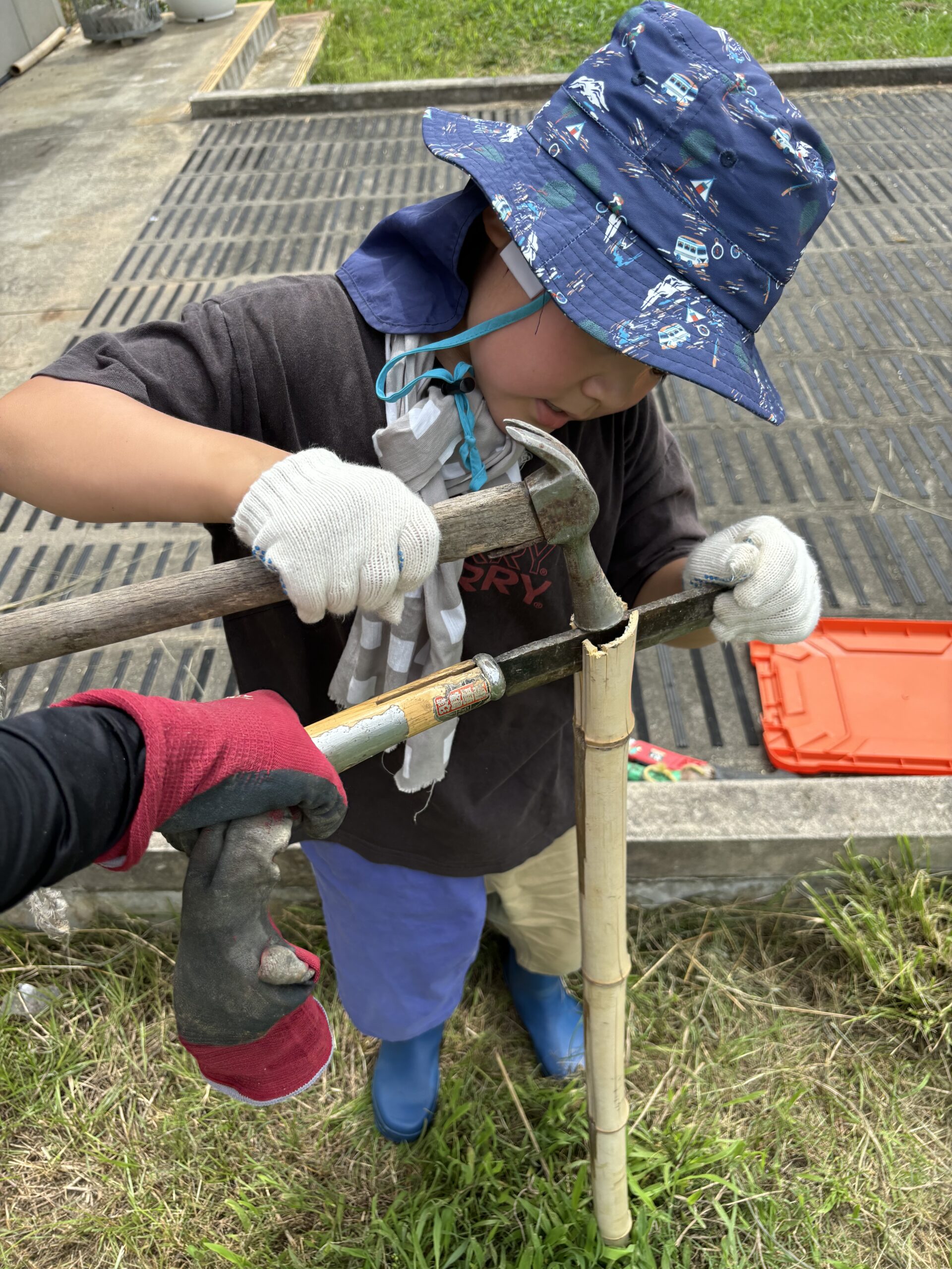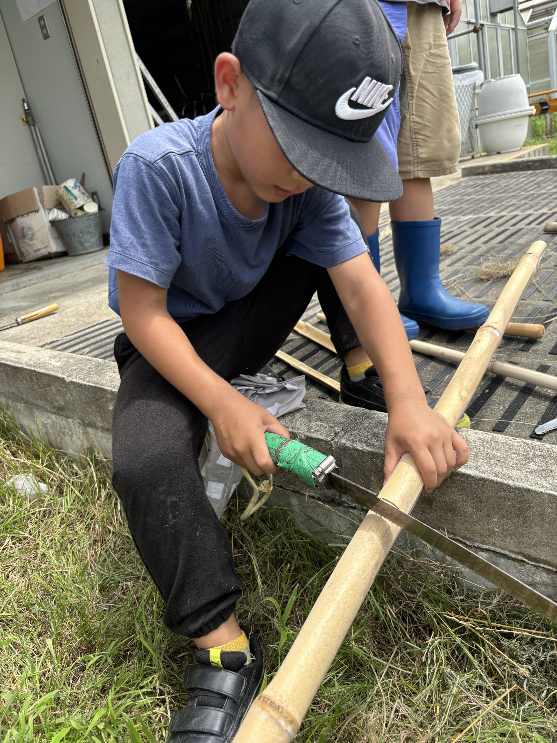 子どもたちもノコギリ、ナタを使って支柱作り。